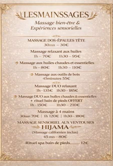Massage Bien-Être & Relaxation Besoin d un moment de détente et de lâcher-prise. Je propose des massages de relaxation visant à réduire le stress et favoriser le bien-être général. ✨ Ambiance calme et apaisante...